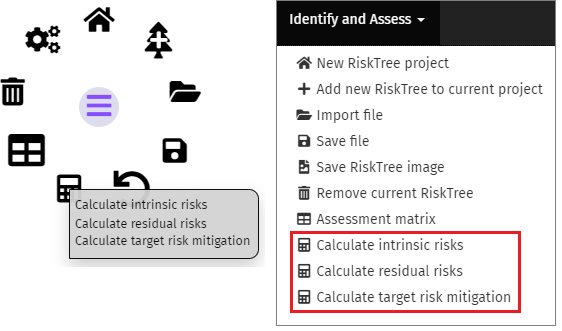 Once you have applied assessment values to your RiskTree, you can calculate the risks by selecting Calculate intrinsic risks from the Identify and Assess menu; this function can also be found on the circular menu: