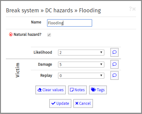 A natural hazard is a type of risk that can be included in a RiskTree. It represents risks that are not caused by a malicious attacker, but instead occur by accident. This could include a flood, a power failure, or a piece of equipment failing. It will have different assessment values to an attack risk. In place of the four attacker values, RiskTree uses a single value for the likelihood of the attack; this expresses the probability that the attack will occur, from highly unlikely (1) to highly likely (6). Natural hazards are indicated in RiskTree with a symbol.